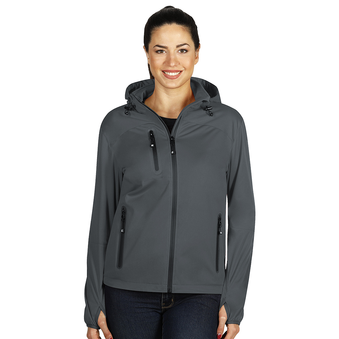 Jakne softshell me kapelë për femra, pranga elastike me rregullues të kapuçit, dy xhepa para me zinxhir dhe një xhep në gjoks, të gjitha zinxhirët janë të papërshkueshëm nga uji, hapja e gishtit të madh në mëngë, ana e pasme më e gjatë se pjesa e përparme