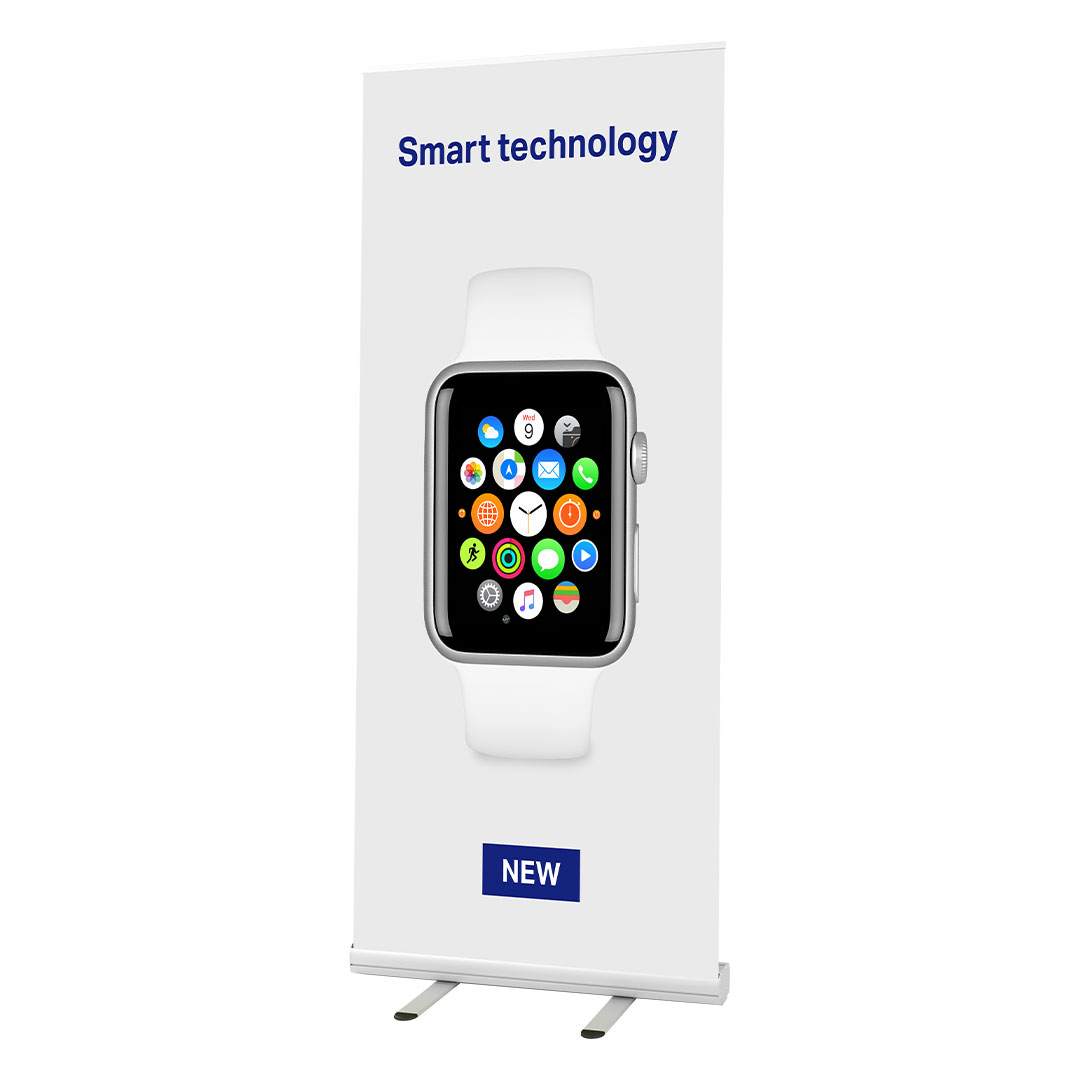 Roll Up 100 është një stand promocional modern me kornizë alumini dhe mekanizëm tërheqës që funksionon në mënyrë të qetë dhe të sigurt. Produkti përdoret për ekspozita, konferenca, eventë të ndryshme, dhe në zyra për të shfaqur logon e kompanisë ose mesazhe promocionale. Paneli për printim (100 cm gjerësi) mund t'i nënshtrohet printimit të lartë cilësie me ngjyra të ndryshme, duke krijuar një prezantim profesional. Qanta mbrojtëse përfshihet për transportin dhe ruajtjen e lehtë. JusaPrint ofron kualitet të garantuar, afate shkurtra prodhimi, dhe personalizim sipas nevojave të çdo biznesi në Kosovë.
