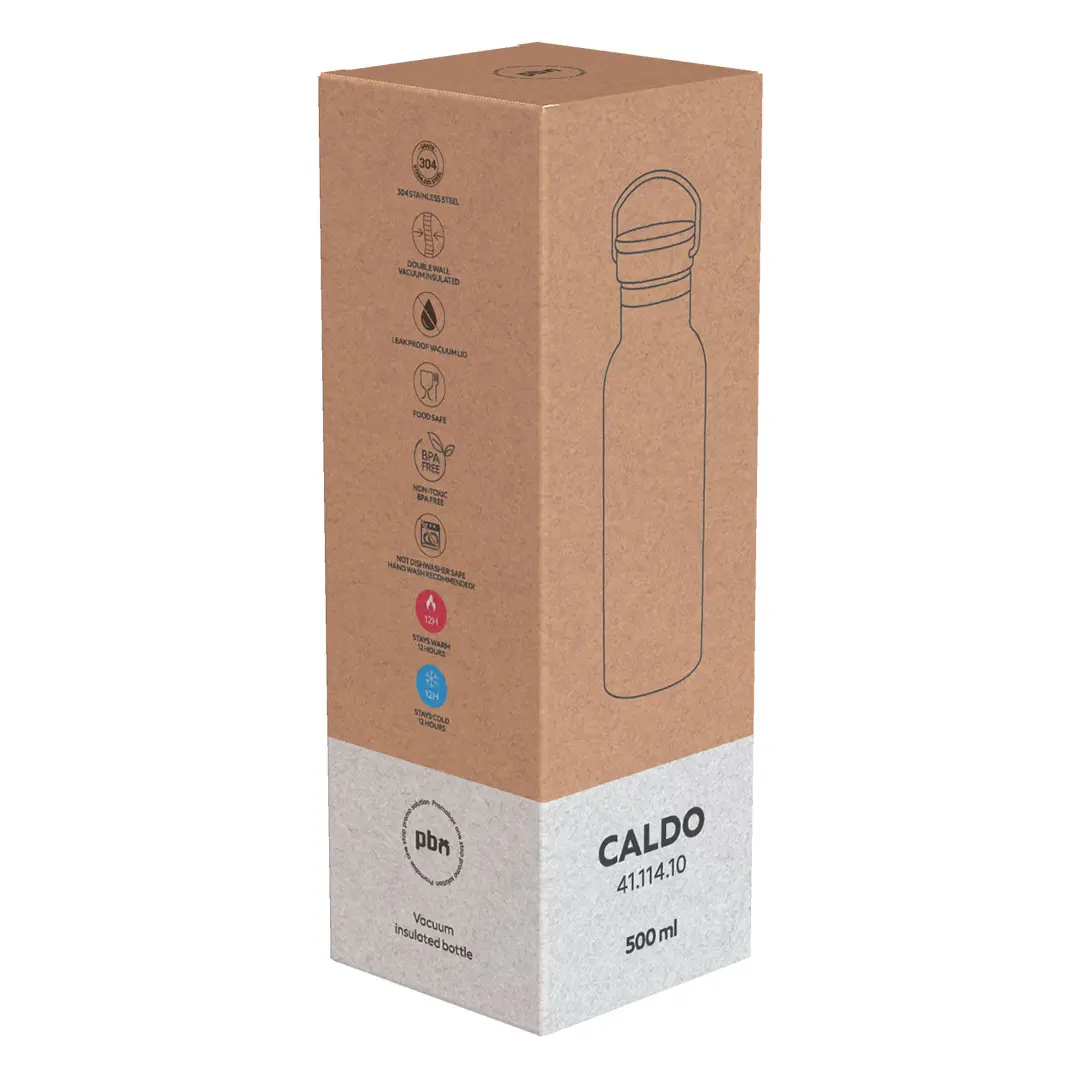 CALDO osht një shishe termosi me kapacitet standard prej 500 ml, e dizajnuar për përdorim të përditshëm si në mjedise biznesi ashtu edhe personale. Një veti dalluese e dizajnit osht pjesa e sipërme e kapakut prej bambuje, që shton një prekë natyrale vizuale dhe osht gjithashtu e përshtatshme për shtypje dhe personalizim. Falë murit të …