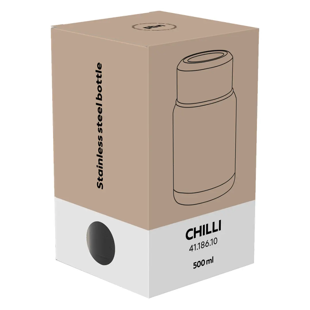 Ene CHILLI për ushqim, me kapacitet prej 500 ml, është një zgjidhje praktike për mbajtjen e vakteve të ngrohta jashtë shtëpisë. E punuar nga çeliku inox dhe e pajisur me mur të dyfishtë me izolim vakumi, ajo ndihmon në ruajtjen e temperaturës së ushqimit për periudha më të gjata, duke e bërë ideale për udhëtim, …