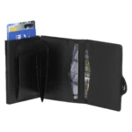 Portofol me mbrojtje RFID i bere nga lekura e vertete, i dizajnuar per ruajtje te sigurt te kartave dhe parave te gatshme. Perfshin nje mbajtes kartash metalik me mekanizem pop-up per qasje te shpejte ne karta. Pjesa e jashtme perfshin nje ndarje me zinxhir, ndersa brendia ofron nje seksion per kartemonedha dhe dy vende shtese …