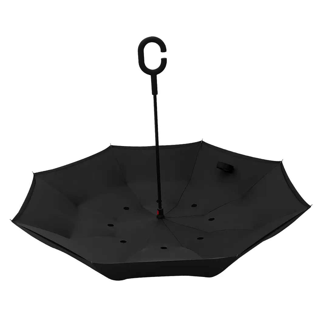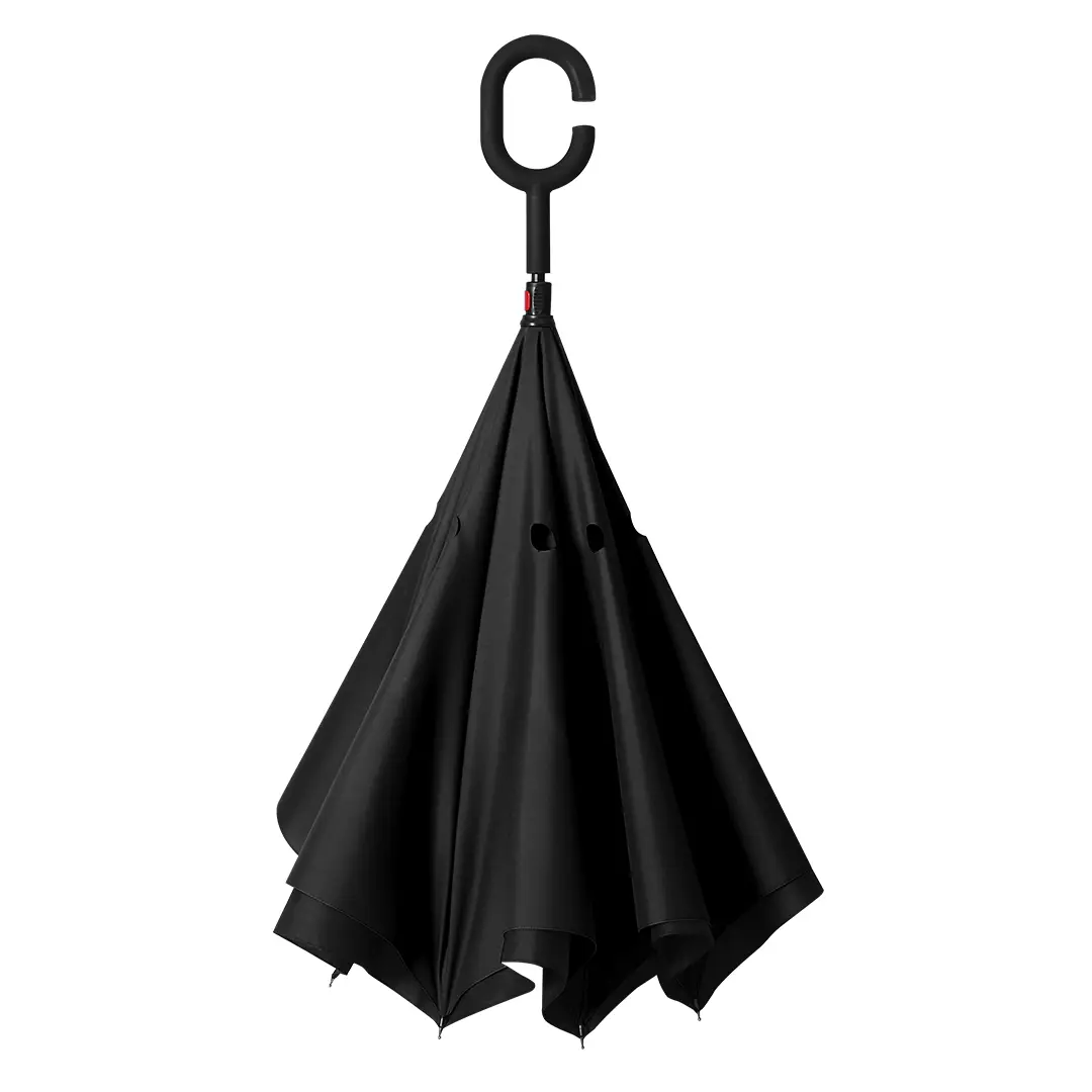 Ombrellë me palosje të kundrt – produkt promovues inovativ dhe praktik për përdorim të përditshëm urban. Sistemi i hapjes manuale i kombinuar me materialin dyshtresor 190T pongee mundëson që uji të mblidhet brenda ombrellës gjatë mbylljes, duke parandaluar lagen e dyshemeve, makinave apo rrobave. Shufra çeliku e veshur me plastikë dhe majat metalike të brinjve …
