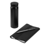 Set dhurate biznesi i perbere nga fletore, stilolaps metalik dhe termos. Fletorja perfshin nje bllok me vija, set fletushkash vetengjitese, mbajtes stilolapsi, vende per karta dhe nje ndarje te madhe te brendshme per dokumente. Sigurohet me rrip elastike per mbyllje. Stilolapsi metalik shkruan me boje te kalter, dhe termosi eshte i bere nga celiku i …