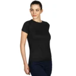 Maicë sportive për femra, 130 g/m2, pak bel, e qepur anash, jakë nga i njëjti material si trupi i bluzës, pëlhurë me funksion përthithjeje dhe tharjeje të shpejtë.